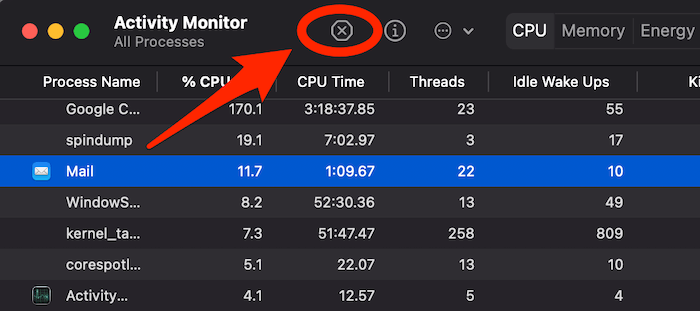 - Click on the X icon on the top left of the Activity Monitor window to close the Mail app.